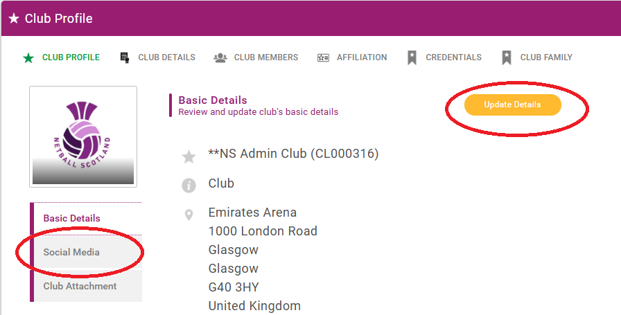You can also add your club's social media handles in the 'Social Media' tab.