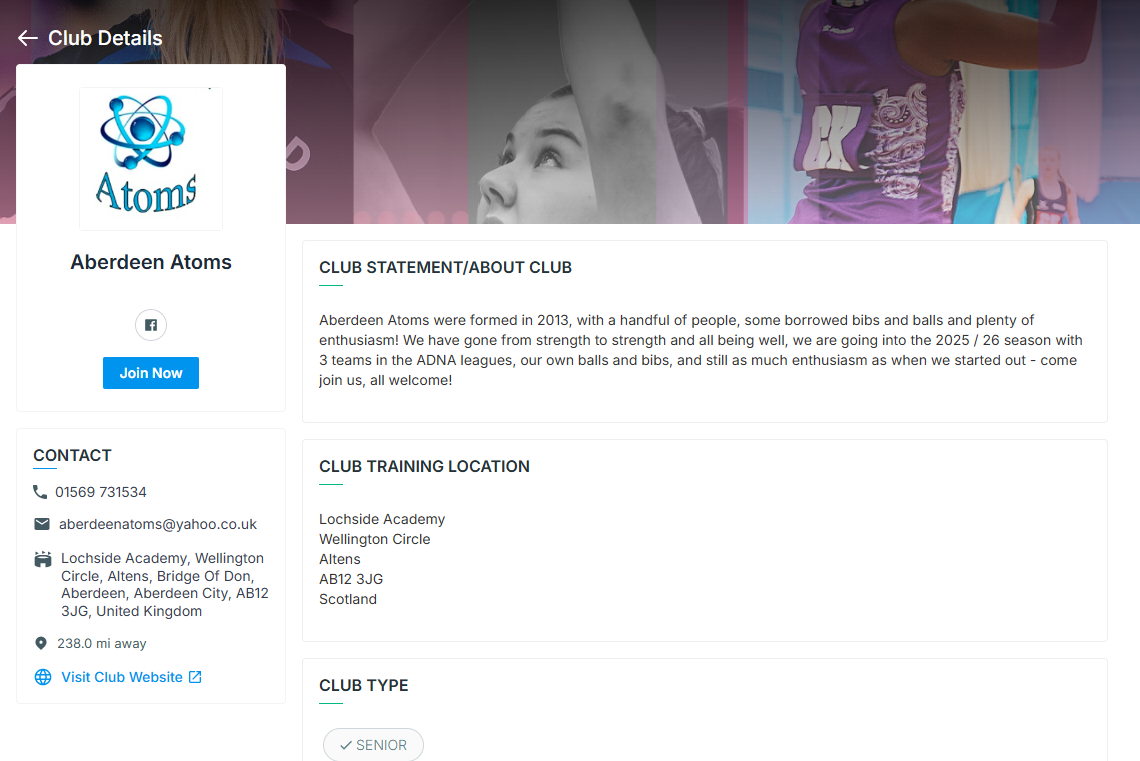 All of these details will then show on your Club Profile on the Netball Scotland Club Finder when your club is selected - see below.